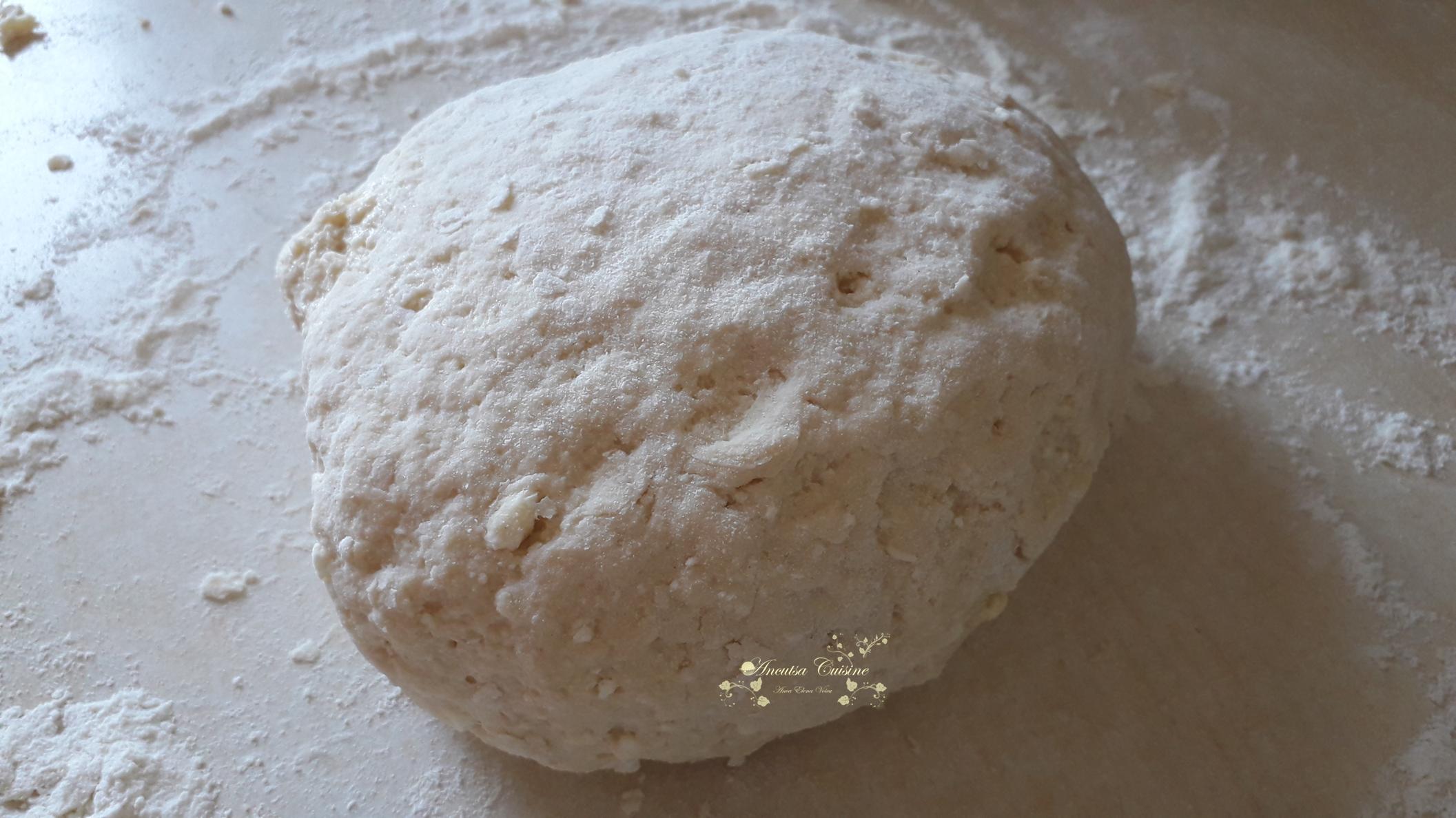 Pui într-un bol încăpător, brânza rasă, untul rece tăiat cubulețe și jumătate din cantitatea de făină și amesteci cu o ustensilă pentru patiserie sau cu o furculiță astfel încât să sfărâmițezi aluatul.