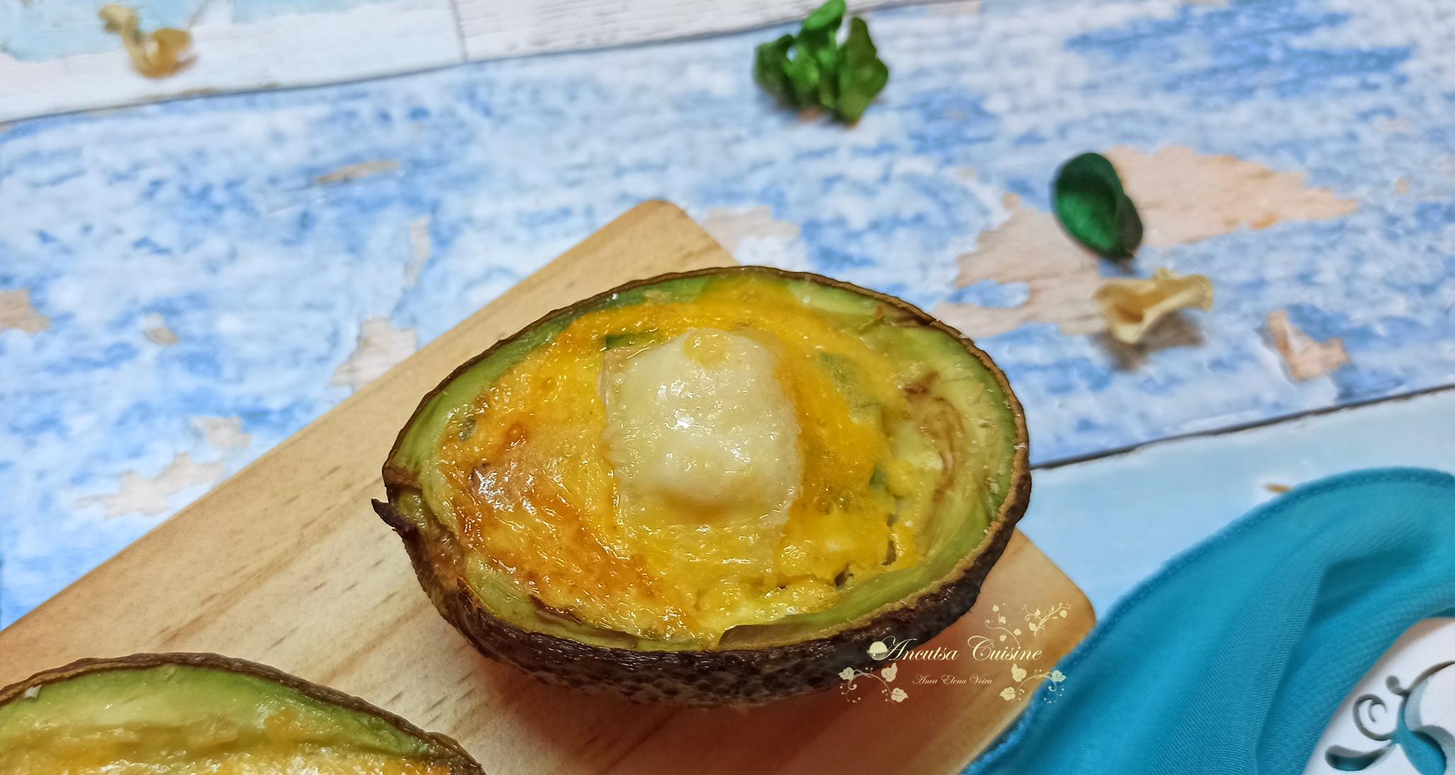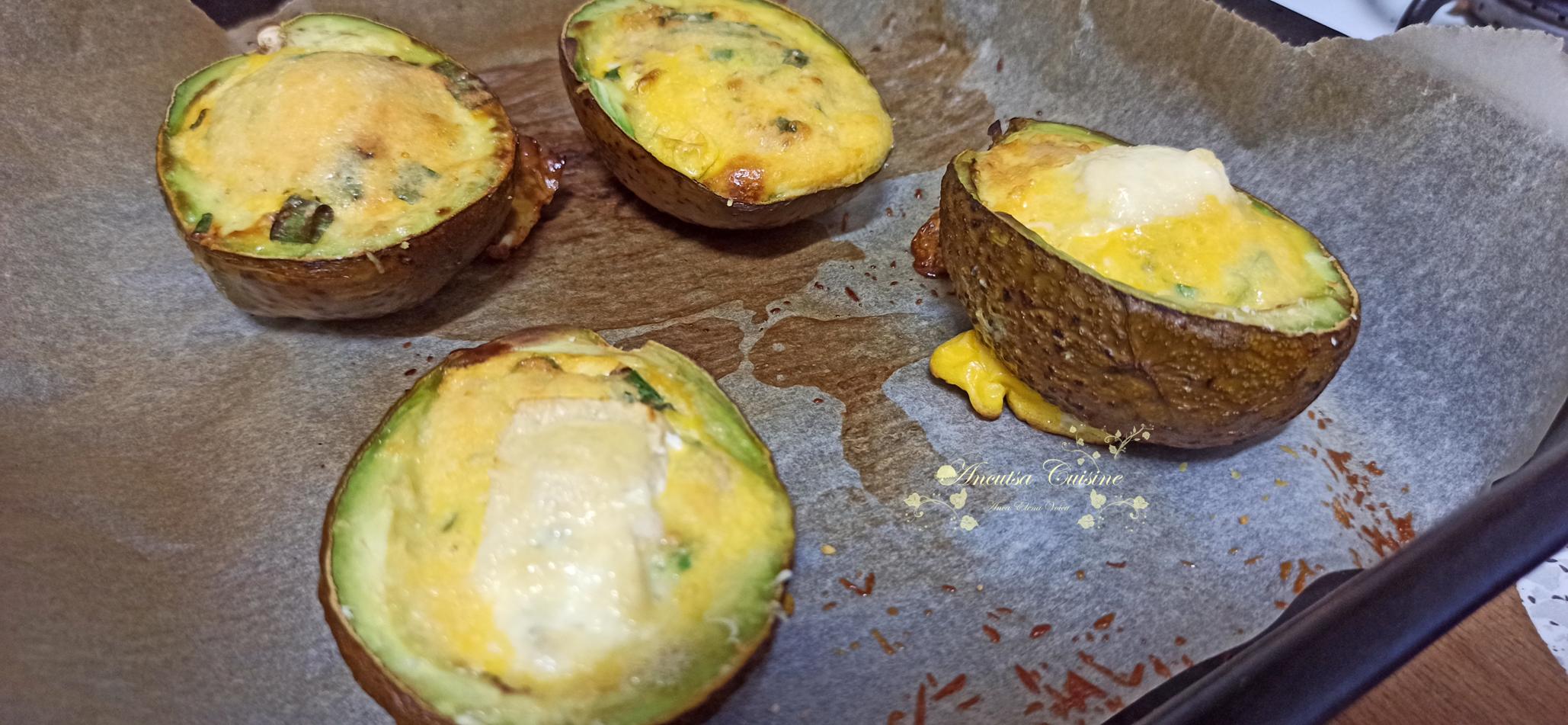 Pentru că sora mea adoră ovocado – adică ouă coapte în coajă de avocado (are până și un tricou preferat cu avocado), am vrut să-i fac o surpriză și să-i pregătesc o gustare, însă voiam ceva mai mult decât un ou într-un avocado. Așa că le-am reinventat, adăugând șuncă și ceapă verde și la final le-am garnisit cu brânză camembert și parmezan. Au ieșit o bunătate. Și cum oul bătut are culoarea galbenă, iar brânza e albă, au ieșit culorile unui ou invers: alb în interior și galben în exterior, ceea ce mi s-a părut simpatic, iar sora mea a fost tare încântată.