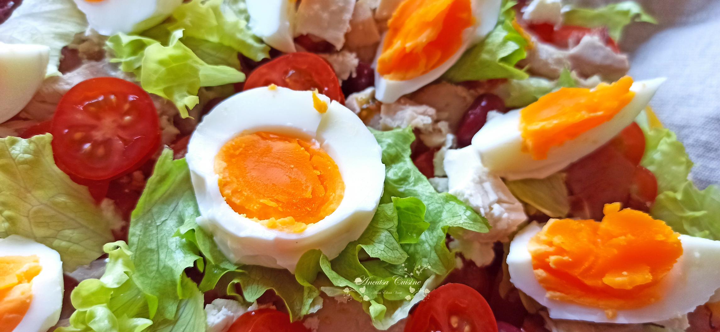 O salată sățioasă și gustoasă cu pui gătit la cuptor, ouă fierte, legume și ulei aromatizat cu busuioc. Inițial o pregătisem pentru mine și sora mea, pentru că mama și tata mâncau altceva, dar până la urmă am mâncat toți din ea, a fost așa bună…