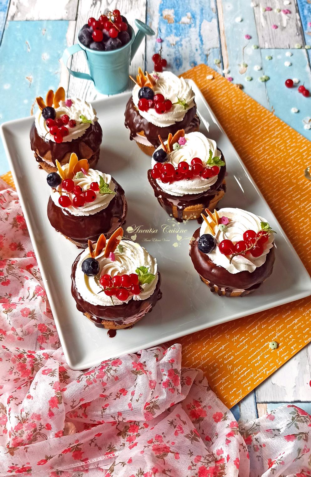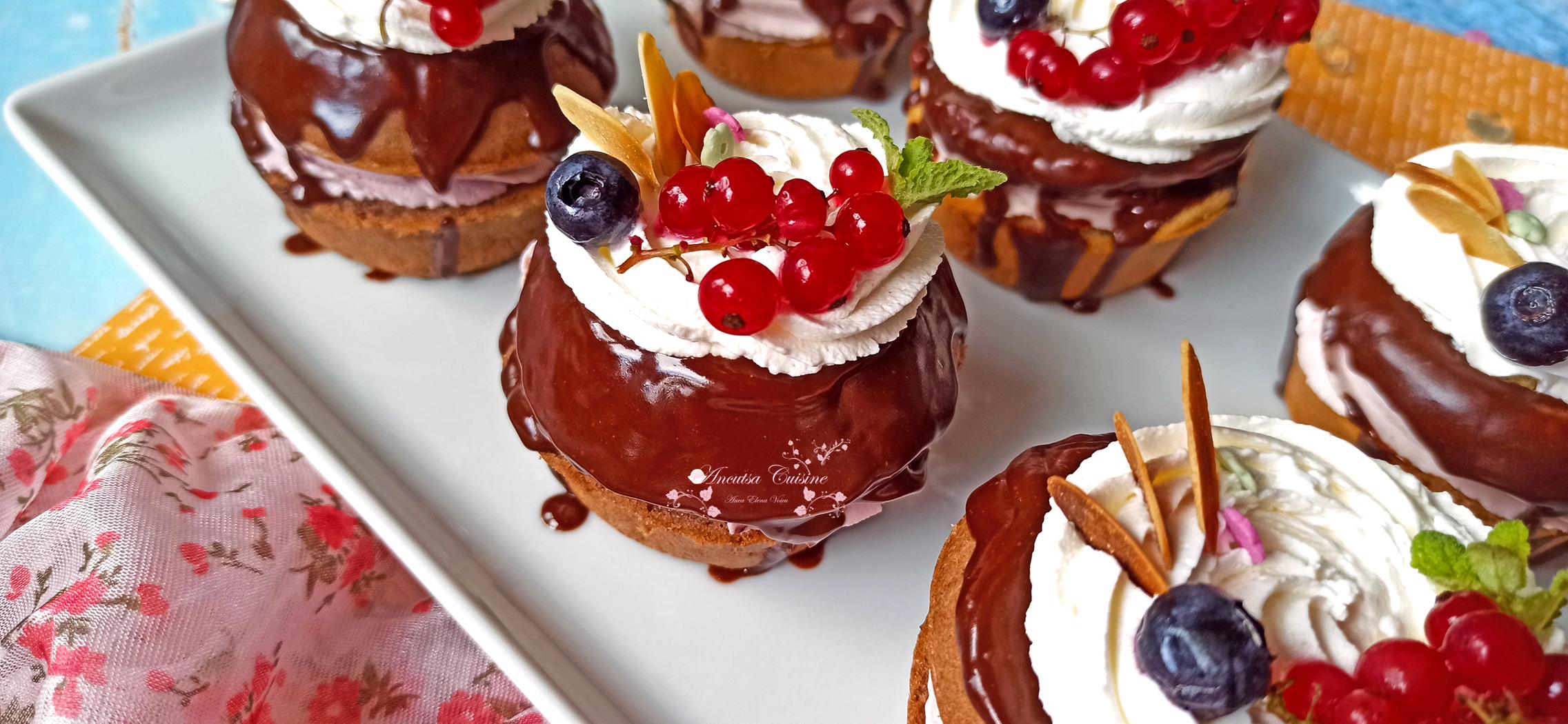 Am pregătit 12 prăjituri: 6 negre, 6 albe, cu apă de flori de trandafir, cremă de fructe (am folosit coulis de mure pentru cele negre, respectiv coulis de zmeură pentru cele albe), le-am decorat cu trandafiri din cremă și le-am ornat cu fructe și migdale.